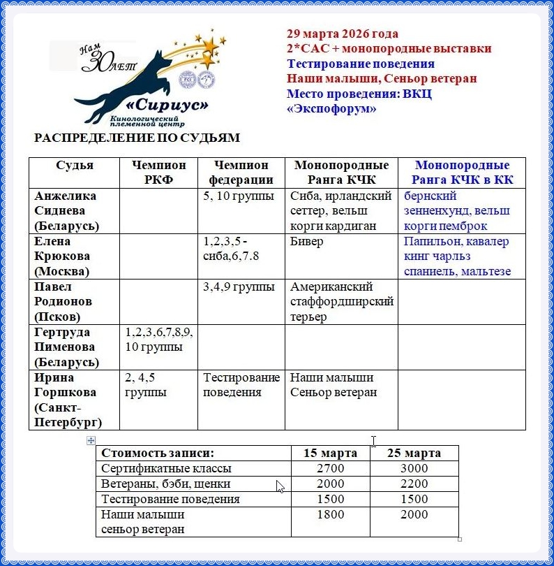 - Организация поездок на международные выставки собак в другие регионы и зарубеж;